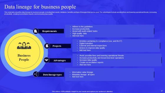 This slide talks about the data lineage for business people, including their needs, initiatives, benefits and type of lineages that can be used. The advantages include avoiding fines and lowering operational threats, increasing productivity, creating reconciliation reports, and increasing data quality. If you are looking for a format to display your unique thoughts, then the professionally designed Data Lineage Implementation Data Lineage For Business People Microsoft PDF is the one for you. You can use it as a Google Slides template or a PowerPoint template. Incorporate impressive visuals, symbols, images, and other charts. Modify or reorganize the text boxes as you desire. Experiment with shade schemes and font pairings. Alter, share or cooperate with other people on your work. Download Data Lineage Implementation Data Lineage For Business People Microsoft PDF and find out how to give a successful presentation. Present a perfect display to your team and make your presentation unforgettable.