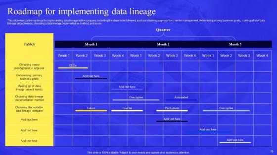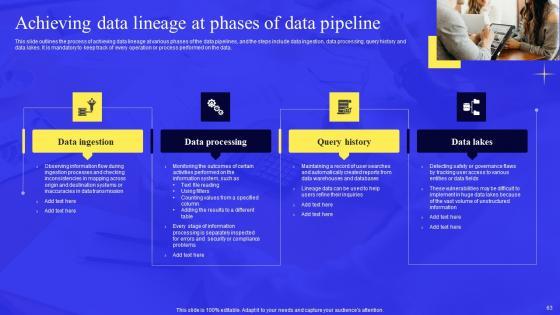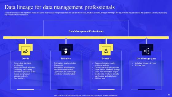 You will save yourself your energy and hours of time when you choose to use this impactful PowerPoint Deck. This Business Process Data Lineage Ppt Powerpoint Presentation Complete Deck With Slides has been tailor-made to your business needs which ensures that you will always be prepared for that next meeting. Worry can not touch you when you present in your area of expertise using this PPT Template Bundle. With a modern design and easy to follow structure, this PowerPoint Presentation has nintey slides, which ensures that you can cover you need to without much work. Create your next presentation using this PPT Theme to deliver a memorable performance. Our Business Process Data Lineage Ppt Powerpoint Presentation Complete Deck With Slides are topically designed to provide an attractive backdrop to any subject. Use them to look like a presentation pro.