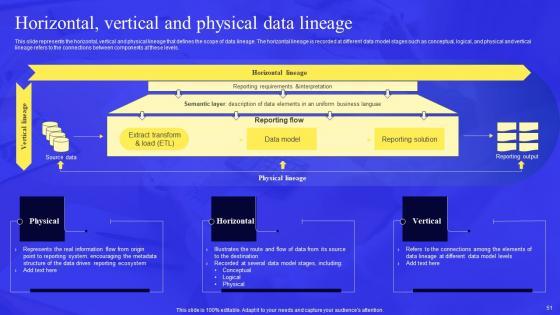 This slide represents the horizontal, vertical and physical lineage that defines the scope of data lineage. The horizontal lineage is recorded at different data model stages such as conceptual, logical, and physical and vertical lineage refers to the connections between components at these levels. Retrieve professionally designed Business Process Data Lineage Horizontal Vertical And Physical Data Lineage Summary Pdf to effectively convey your message and captivate your listeners. Save time by selecting pre made slideshows that are appropriate for various topics, from business to educational purposes. These themes come in many different styles, from creative to corporate, and all of them are easily adjustable and can be edited quickly. Access them as PowerPoint templates or as Google Slides themes. You do not have to go on a hunt for the perfect presentation because Slidegeeks got you covered from everywhere. This slide represents the horizontal, vertical and physical lineage that defines the scope of data lineage. The horizontal lineage is recorded at different data model stages such as conceptual, logical, and physical and vertical lineage refers to the connections between components at these levels.