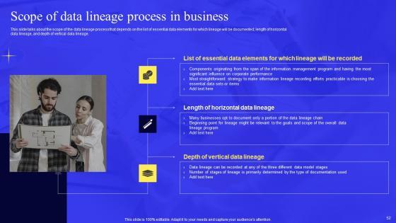This slide talks about the scope of the data lineage process that depends on the list of essential data elements for which lineage will be documented, length of horizontal data lineage, and depth of vertical data lineage. Whether you have daily or monthly meetings, a brilliant presentation is necessary. Data Lineage Implementation Scope Of Data Lineage Process In Business Ideas PDF can be your best option for delivering a presentation. Represent everything in detail using Data Lineage Implementation Scope Of Data Lineage Process In Business Ideas PDF and make yourself stand out in meetings. The template is versatile and follows a structure that will cater to your requirements. All the templates prepared by Slidegeeks are easy to download and edit. Our research experts have taken care of the corporate themes as well. So, give it a try and see the results.