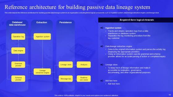 This slide depicts the reference architecture for building passive data lineage system in an organization, including three logical components such as ingestion system, data lineage extraction engine, and lineage store. Present like a pro with Business Process Data Lineage Reference Architecture For Building Passive Data Lineage System Mockup Pdf Create beautiful presentations together with your team, using our easy to use presentation slides. Share your ideas in real time and make changes on the fly by downloading our templates. So whether you are in the office, on the go, or in a remote location, you can stay in sync with your team and present your ideas with confidence. With Slidegeeks presentation got a whole lot easier. Grab these presentations today. This slide depicts the reference architecture for building passive data lineage system in an organization, including three logical components such as ingestion system, data lineage extraction engine, and lineage store.