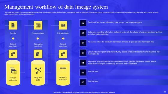 This slide represents the management workflow of the data lineage system that includes components such as data files, dataset descriptors, primary datasets, observation descriptors, integrated information, extracted data, dataset descriptors, and analysis datasets. Boost your pitch with our creative Business Process Data Lineage Management Workflow Of Data Lineage System Designs Pdf. Deliver an awe inspiring pitch that will mesmerize everyone. Using these presentation templates you will surely catch everyones attention. You can browse the ppts collection on our website. We have researchers who are experts at creating the right content for the templates. So you do not have to invest time in any additional work. Just grab the template now and use them. This slide represents the management workflow of the data lineage system that includes components such as data files, dataset descriptors, primary datasets, observation descriptors, integrated information, extracted data, dataset descriptors, and analysis datasets.