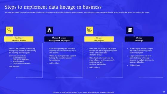 This slide represents the steps to implement data lineage in business, and it includes finding key business drivers, onboarding the senior management on the project, scoping the project, and defining the scope. Find highly impressive Data Lineage Implementation Steps To Implement Data Lineage In Business Clipart PDF on Slidegeeks to deliver a meaningful presentation. You can save an ample amount of time using these presentation templates. No need to worry to prepare everything from scratch because Slidegeeks experts have already done a huge research and work for you. You need to download v for your upcoming presentation. All the presentation templates are 100 percent editable and you can change the color and personalize the content accordingly. Download now.