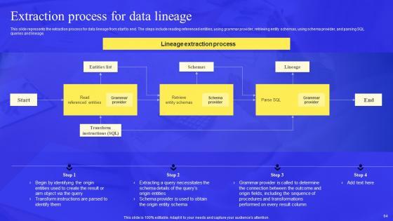 This slide represents the extraction process for data lineage from start to end. The steps include reading referenced entities, using grammar provider, retrieving entity schemas, using schema provider, and parsing SQL queries and lineage. Explore a selection of the finest Business Process Data Lineage Extraction Process For Data Lineage Topics Pdf here. With a plethora of professionally designed and pre made slide templates, you can quickly and easily find the right one for your upcoming presentation. You can use our Business Process Data Lineage Extraction Process For Data Lineage Topics Pdf to effectively convey your message to a wider audience. Slidegeeks has done a lot of research before preparing these presentation templates. The content can be personalized and the slides are highly editable. Grab templates today from Slidegeeks. This slide represents the extraction process for data lineage from start to end. The steps include reading referenced entities, using grammar provider, retrieving entity schemas, using schema provider, and parsing SQL queries and lineage.