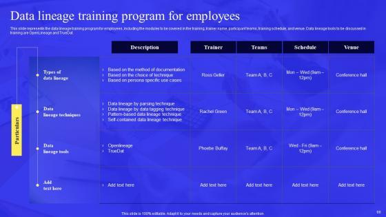 This slide represents the data lineage training program for employees, including the modules to be covered in the training, trainer name, participant teams, training schedule, and venue. Data lineage tools to be discussed in training are OpenLineage and TrueDat. Coming up with a presentation necessitates that the majority of the effort goes into the content and the message you intend to convey. The visuals of a PowerPoint presentation can only be effective if it supplements and supports the story that is being told. Keeping this in mind our experts created Business Process Data Lineage Data Lineage Training Program For Employees Download Pdf to reduce the time that goes into designing the presentation. This way, you can concentrate on the message while our designers take care of providing you with the right template for the situation. This slide represents the data lineage training program for employees, including the modules to be covered in the training, trainer name, participant teams, training schedule, and venue. Data lineage tools to be discussed in training are OpenLineage and TrueDat.