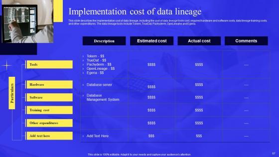 This slide describes the implementation cost of data lineage, including the cost of data lineage tools cost, required hardware and software costs, data lineage training costs, and other expenditures. The data lineage tools include Tokern, TrueDat, Pachyderm, OpnLineahe and Egeria. Here you can discover an assortment of the finest PowerPoint and Google Slides templates. With these templates, you can create presentations for a variety of purposes while simultaneously providing your audience with an eye catching visual experience. Download Business Process Data Lineage Implementation Cost Of Data Lineage Microsoft Pdf to deliver an impeccable presentation. These templates will make your job of preparing presentations much quicker, yet still, maintain a high level of quality. Slidegeeks has experienced researchers who prepare these templates and write high quality content for you. Later on, you can personalize the content by editing the Business Process Data Lineage Implementation Cost Of Data Lineage Microsoft Pdf. This slide describes the implementation cost of data lineage, including the cost of data lineage tools cost, required hardware and software costs, data lineage training costs, and other expenditures. The data lineage tools include Tokern, TrueDat, Pachyderm, OpnLineahe and Egeria.