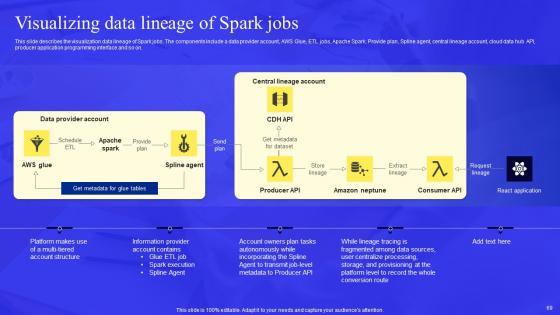 This slide describes the visualization data lineage of Spark jobs. The components include a data provider account, AWS Glue, ETL jobs, Apache Spark, Provide plan, Spline agent, central lineage account, cloud data hub API, producer application programming interface and so on. Coming up with a presentation necessitates that the majority of the effort goes into the content and the message you intend to convey. The visuals of a PowerPoint presentation can only be effective if it supplements and supports the story that is being told. Keeping this in mind our experts created Business Process Data Lineage Visualizing Data Lineage Of Spark Jobs Ideas Pdf to reduce the time that goes into designing the presentation. This way, you can concentrate on the message while our designers take care of providing you with the right template for the situation. This slide describes the visualization data lineage of Spark jobs. The components include a data provider account, AWS Glue, ETL jobs, Apache Spark, Provide plan, Spline agent, central lineage account, cloud data hub API, producer application programming interface and so on.