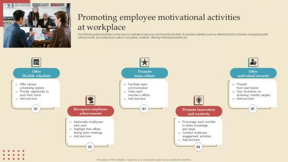 The following slide illustrates some ways to motivate employees and boost productivity. It includes activities such as offering flexible schedule, recognizing staff achievements, promoting team culture, innovation, creativity, offering individual rewards etc. Whether you have daily or monthly meetings, a brilliant presentation is necessary. Promoting Employee Motivational Describing Business Performance Administration Goals Inspiration Pdf can be your best option for delivering a presentation. Represent everything in detail using Promoting Employee Motivational Describing Business Performance Administration Goals Inspiration Pdf and make yourself stand out in meetings. The template is versatile and follows a structure that will cater to your requirements. All the templates prepared by Slidegeeks are easy to download and edit. Our research experts have taken care of the corporate themes as well. So, give it a try and see the results. The following slide illustrates some ways to motivate employees and boost productivity. It includes activities such as offering flexible schedule, recognizing staff achievements, promoting team culture, innovation, creativity, offering individual rewards etc.
