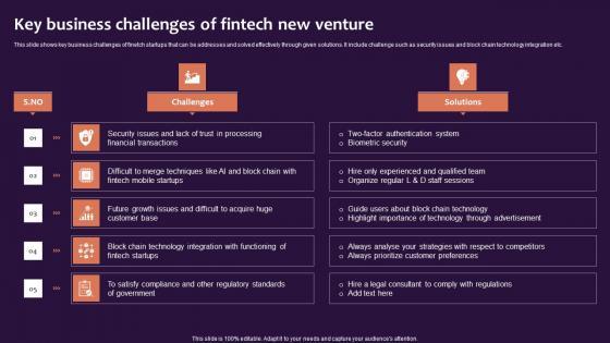 This slide shows key business challenges of finetch startups that can be addresses and solved effectively through given solutions. It include challenge such as security issues and block chain technology integration etc. Showcasing this set of slides titled Key Business Challenges Of Fintech New Venture Infographics Pdf. The topics addressed in these templates are Challenges, Solutions. All the content presented in this PPT design is completely editable. Download it and make adjustments in color, background, font etc. as per your unique business setting. This slide shows key business challenges of finetch startups that can be addresses and solved effectively through given solutions. It include challenge such as security issues and block chain technology integration etc.