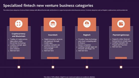 This slide shows categories of various fintech startups with different functionality and functions to support and provide online financial services. It include categories such as Regtech, cyrptocurrency and insuretech etc. Pitch your topic with ease and precision using this Specialized Fintech New Venture Business Categories Background Pdf. This layout presents information on Cryptocurrency And Blockchain, Insuretech, Regtech. It is also available for immediate download and adjustment. So, changes can be made in the color, design, graphics or any other component to create a unique layout. This slide shows categories of various fintech startups with different functionality and functions to support and provide online financial services. It include categories such as Regtech, cyrptocurrency and insuretech etc.