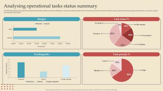 The following slide showcases the business performance status summary to effectively measure results and outcomes. It includes elements such as task status, priority, planned and actual budget, pending tasks, decisions, actions and change requests etc. Coming up with a presentation necessitates that the majority of the effort goes into the content and the message you intend to convey. The visuals of a PowerPoint presentation can only be effective if it supplements and supports the story that is being told. Keeping this in mind our experts created Analysing Operational Describing Business Performance Administration Goals Inspiration Pdf to reduce the time that goes into designing the presentation. This way, you can concentrate on the message while our designers take care of providing you with the right template for the situation. The following slide showcases the business performance status summary to effectively measure results and outcomes. It includes elements such as task status, priority, planned and actual budget, pending tasks, decisions, actions and change requests etc.