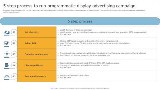 Mentioned slide covers the steps to practice a programmatic display advertising campaign. It incorporates major stages such as setting objective, DSP selection, optimization and expansion, selecting publisher and monitoring performance. Do you have to make sure that everyone on your team knows about any specific topic I yes, then you should give Techniques To Optimize Business Performance 5 Step Process To Run Programmatic Display Sample Pdf a try. Our experts have put a lot of knowledge and effort into creating this impeccable Techniques To Optimize Business Performance 5 Step Process To Run Programmatic Display Sample Pdf. You can use this template for your upcoming presentations, as the slides are perfect to represent even the tiniest detail. You can download these templates from the Slidegeeks website and these are easy to edit. So grab these today. Mentioned slide covers the steps to practice a programmatic display advertising campaign. It incorporates major stages such as setting objective, DSP selection, optimization and expansion, selecting publisher and monitoring performance.