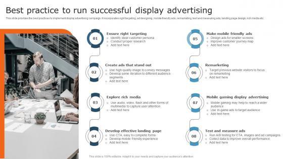 This slide provides the best practices to implement display advertising campaign. It incorporates right targeting, ad designing, mobile friendly ads, remarketing, test and measuring ads, landing page design, rich media etc. From laying roadmaps to briefing everything in detail, our templates are perfect for you. You can set the stage with your presentation slides. All you have to do is download these easy-to-edit and customizable templates. Techniques To Optimize Business Performance Best Practice To Run Successful Display Advertising Rules Pdf will help you deliver an outstanding performance that everyone would remember and praise you for. Do download this presentation today. This slide provides the best practices to implement display advertising campaign. It incorporates right targeting, ad designing, mobile friendly ads, remarketing, test and measuring ads, landing page design, rich media etc.