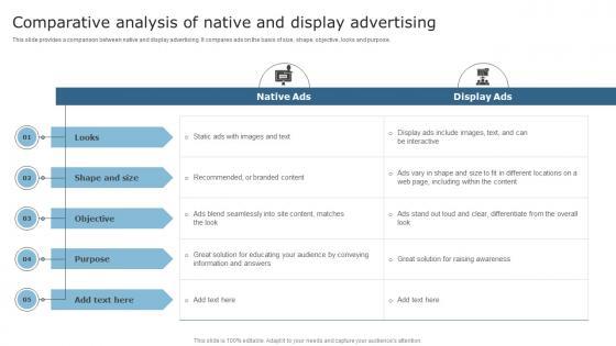 This slide provides a comparison between native and display advertising. It compares ads on the basis of size, shape, objective, looks and purpose. Do you have an important presentation coming up Are you looking for something that will make your presentation stand out from the rest Look no further than Techniques To Optimize Business Performance Comparative Analysis Of Native And Display Summary Pdf. With our professional designs, you can trust that your presentation will pop and make delivering it a smooth process. And with Slidegeeks, you can trust that your presentation will be unique and memorable. So why wait Grab Techniques To Optimize Business Performance Comparative Analysis Of Native And Display Summary Pdf today and make your presentation stand out from the rest. This slide provides a comparison between native and display advertising. It compares ads on the basis of size, shape, objective, looks and purpose.