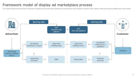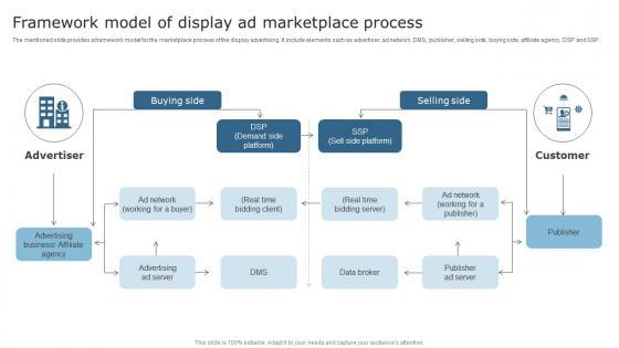 The mentioned slide provides a framework model for the marketplace process of the display advertising. It include elements such as advertiser, ad network, DMS, publisher, selling side, buying side, affiliate agency, DSP and SSP. Crafting an eye-catching presentation has never been more straightforward. Let your presentation shine with this tasteful yet straightforward Techniques To Optimize Business Performance Framework Model Of Display Ad Marketplace Process Clipart Pdf template. It offers a minimalistic and classy look that is great for making a statement. The colors have been employed intelligently to add a bit of playfulness while still remaining professional. Construct the ideal Techniques To Optimize Business Performance Framework Model Of Display Ad Marketplace Process Clipart Pdf that effortlessly grabs the attention of your audience. Begin now and be certain to wow your customers. The mentioned slide provides a framework model for the marketplace process of the display advertising. It include elements such as advertiser, ad network, DMS, publisher, selling side, buying side, affiliate agency, DSP and SSP.
