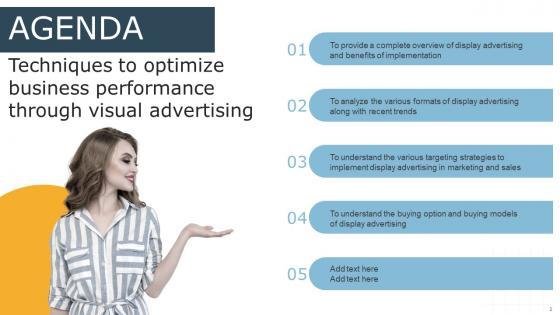 Find a pre-designed and impeccable Agenda Techniques To Optimize Business Performance Through Visual Advertising Template Pdf. The templates can ace your presentation without additional effort. You can download these easy-to-edit presentation templates to make your presentation stand out from others. So, what are you waiting for Download the template from Slidegeeks today and give a unique touch to your presentation. Our Agenda Techniques To Optimize Business Performance Through Visual Advertising Template Pdf are topically designed to provide an attractive backdrop to any subject. Use them to look like a presentation pro.