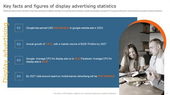 Mentioned slide provides overview of major facts and figures of affiliate marketing. It incorporate annual change in advertising spendings, average CPC of google and facebook, annual earning by google via display advertising. Formulating a presentation can take up a lot of effort and time, so the content and message should always be the primary focus. The visuals of the PowerPoint can enhance the presenters message, so our Techniques To Optimize Business Performance Key Facts And Figures Of Display Advertising Diagrams Pdf was created to help save time. Instead of worrying about the design, the presenter can concentrate on the message while our designers work on creating the ideal templates for whatever situation is needed. Slidegeeks has experts for everything from amazing designs to valuable content, we have put everything into Techniques To Optimize Business Performance Key Facts And Figures Of Display Advertising Diagrams Pdf. Mentioned slide provides overview of major facts and figures of affiliate marketing. It incorporate annual change in advertising spendings, average CPC of google and facebook, annual earning by google via display advertising.