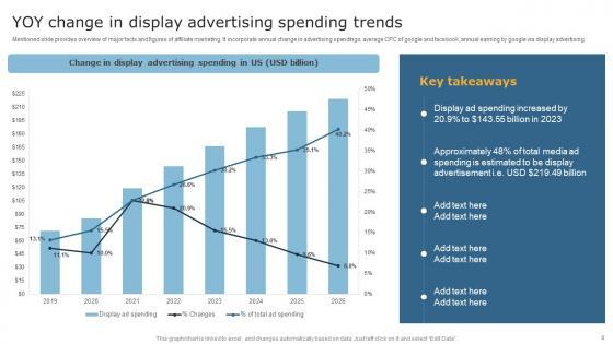 Mentioned slide provides overview of major facts and figures of affiliate marketing. It incorporate annual change in advertising spendings, average CPC of google and facebook, annual earning by google via display advertising. Find a pre-designed and impeccable Techniques To Optimize Business Performance Yoy Change In Display Advertising Spending Summary Pdf. The templates can ace your presentation without additional effort. You can download these easy-to-edit presentation templates to make your presentation stand out from others. So, what are you waiting for Download the template from Slidegeeks today and give a unique touch to your presentation. Mentioned slide provides overview of major facts and figures of affiliate marketing. It incorporate annual change in advertising spendings, average CPC of google and facebook, annual earning by google via display advertising.