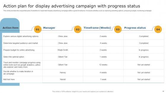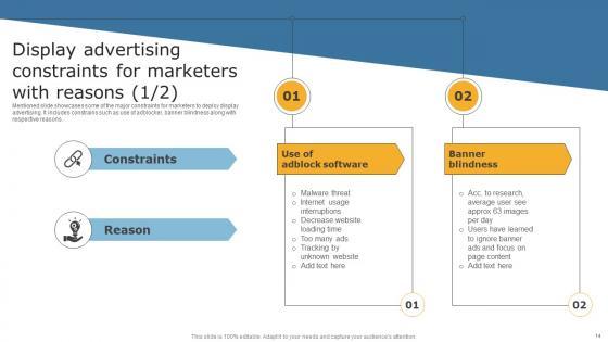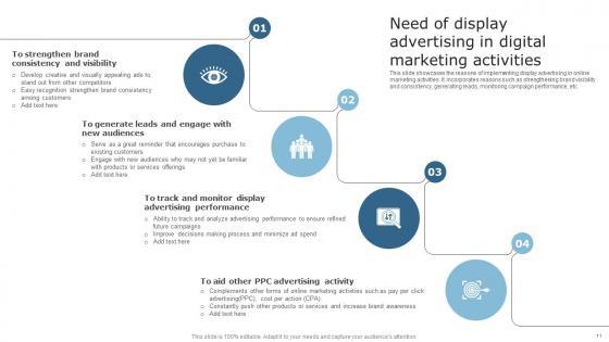 This slide showcases the reasons of implementing display advertising in online marketing activities. It incorporates reasons such as strengthening brand visibility and consistency, generating leads, monitoring campaign performance, etc. Explore a selection of the finest Techniques To Optimize Business Performance Need Of Display Advertising In Digital Marketing Formats Pdf here. With a plethora of professionally designed and pre-made slide templates, you can quickly and easily find the right one for your upcoming presentation. You can use our Techniques To Optimize Business Performance Need Of Display Advertising In Digital Marketing Formats Pdf to effectively convey your message to a wider audience. Slidegeeks has done a lot of research before preparing these presentation templates. The content can be personalized and the slides are highly editable. Grab templates today from Slidegeeks. This slide showcases the reasons of implementing display advertising in online marketing activities. It incorporates reasons such as strengthening brand visibility and consistency, generating leads, monitoring campaign performance, etc.
