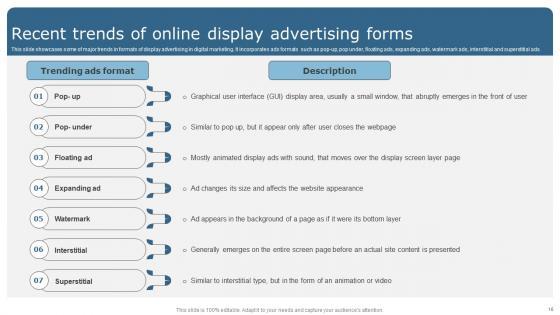 This slide showcases some of major trends in formats of display advertising in digital marketing. It incorporates ads formats such as pop-up, pop under, floating ads, expanding ads, watermark ads, interstitial and superstitial ads. Here you can discover an assortment of the finest PowerPoint and Google Slides templates. With these templates, you can create presentations for a variety of purposes while simultaneously providing your audience with an eye-catching visual experience. Download Techniques To Optimize Business Performance Recent Trends Of Online Display Advertising Guidelines Pdf to deliver an impeccable presentation. These templates will make your job of preparing presentations much quicker, yet still, maintain a high level of quality. Slidegeeks has experienced researchers who prepare these templates and write high-quality content for you. Later on, you can personalize the content by editing the Techniques To Optimize Business Performance Recent Trends Of Online Display Advertising Guidelines Pdf. This slide showcases some of major trends in formats of display advertising in digital marketing. It incorporates ads formats such as pop-up, pop under, floating ads, expanding ads, watermark ads, interstitial and superstitial ads.