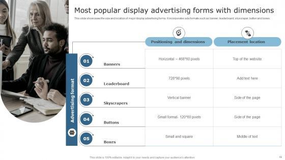 This slide showcases the size and location of major display advertising forms. It incorporates ads formats such as banner, leaderboard, skyscraper, button and boxes. Welcome to our selection of the Techniques To Optimize Business Performance Most Popular Display Advertising Forms Information Pdf. These are designed to help you showcase your creativity and bring your sphere to life. Planning and Innovation are essential for any business that is just starting out. This collection contains the designs that you need for your everyday presentations. All of our PowerPoints are 100 percent editable, so you can customize them to suit your needs. This multi-purpose template can be used in various situations. Grab these presentation templates today. This slide showcases the size and location of major display advertising forms. It incorporates ads formats such as banner, leaderboard, skyscraper, button and boxes.