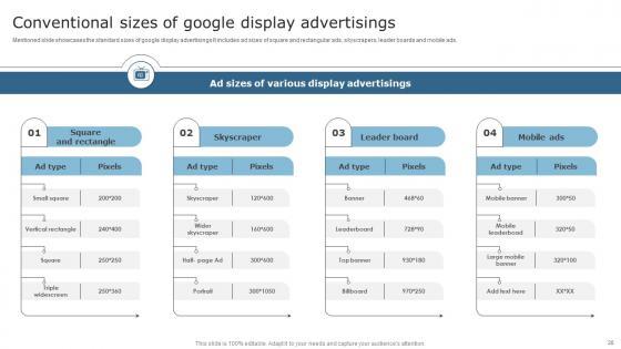 Mentioned slide showcases the standard sizes of google display advertisings It includes ad sizes of square and rectangular ads, skyscrapers, leader boards and mobile ads. Whether you have daily or monthly meetings, a brilliant presentation is necessary. Techniques To Optimize Business Performance Conventional Sizes Of Google Display Advertisings Template Pdf can be your best option for delivering a presentation. Represent everything in detail using Techniques To Optimize Business Performance Conventional Sizes Of Google Display Advertisings Template Pdf and make yourself stand out in meetings. The template is versatile and follows a structure that will cater to your requirements. All the templates prepared by Slidegeeks are easy to download and edit. Our research experts have taken care of the corporate themes as well. So, give it a try and see the results. Mentioned slide showcases the standard sizes of google display advertisings It includes ad sizes of square and rectangular ads, skyscrapers, leader boards and mobile ads.
