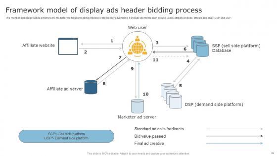 The mentioned slide provides a framework model for the header bidding process of the display advertising. It include elements such as web users, affiliate website, affiliate ad server, DSP and SSP. Slidegeeks is one of the best resources for PowerPoint templates. You can download easily and regulate Framework Model Of Display Ads Header Bidding Techniques To Optimize Business Performance Portrait Pdf for your personal presentations from our wonderful collection. A few clicks is all it takes to discover and get the most relevant and appropriate templates. Use our Templates to add a unique zing and appeal to your presentation and meetings. All the slides are easy to edit and you can use them even for advertisement purposes. The mentioned slide provides a framework model for the header bidding process of the display advertising. It include elements such as web users, affiliate website, affiliate ad server, DSP and SSP.