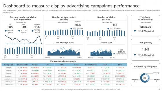 This slide provides a dashboard to monitor the display advertising campaign performance in order to reduce overall marketing cost. It incorporates advertising cost, average number of clicks and impressions, clicks per day, revenue by campaign, etc. If your project calls for a presentation, then Slidegeeks is your go-to partner because we have professionally designed, easy-to-edit templates that are perfect for any presentation. After downloading, you can easily edit Techniques To Optimize Business Performance Dashboard To Measure Display Advertising Icons Pdf and make the changes accordingly. You can rearrange slides or fill them with different images. Check out all the handy templates This slide provides a dashboard to monitor the display advertising campaign performance in order to reduce overall marketing cost. It incorporates advertising cost, average number of clicks and impressions, clicks per day, revenue by campaign, etc.