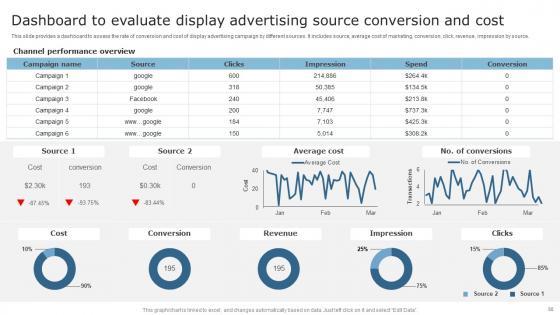 This slide provides a dashboard to assess the rate of conversion and cost of display advertising campaign by different sources. It includes source, average cost of marketing, conversion, click, revenue, impression by source. Find highly impressive Techniques To Optimize Business Performance Dashboard To Evaluate Display Advertising Inspiration Pdf on Slidegeeks to deliver a meaningful presentation. You can save an ample amount of time using these presentation templates. No need to worry to prepare everything from scratch because Slidegeeks experts have already done a huge research and work for you. You need to download Techniques To Optimize Business Performance Dashboard To Evaluate Display Advertising Inspiration Pdf for your upcoming presentation. All the presentation templates are 100 percent editable and you can change the color and personalize the content accordingly. Download now. This slide provides a dashboard to assess the rate of conversion and cost of display advertising campaign by different sources. It includes source, average cost of marketing, conversion, click, revenue, impression by source.