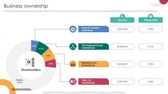 The following slide outlines ownership structure of eBay company which consists of various investor types, number of shares owned and ownership percentage. It outlines investor types such as individual and institutional.There are so many reasons you need a Business Ownership C2C Ecommerce Platform Company Profile CP SS V. The first reason is you can not spend time making everything from scratch, Thus, Slidegeeks has made presentation templates for you too. You can easily download these templates from our website easily. The following slide outlines ownership structure of eBay company which consists of various investor types, number of shares owned and ownership percentage. It outlines investor types such as individual and institutional.