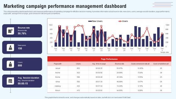 This slide presents a dashboard to track and measure performance of marketing campaign for effective decision making. It provides information about bounce rate, new users, users, average session duration, page performance, page path, average time on page, goal conversion rate and goal completions. Explore a selection of the finest Efficient Marketing Process For Business Marketing Campaign Performance Management Brochure Pdf here. With a plethora of professionally designed and pre-made slide templates, you can quickly and easily find the right one for your upcoming presentation. You can use our Efficient Marketing Process For Business Marketing Campaign Performance Management Brochure Pdf to effectively convey your message to a wider audience. Slidegeeks has done a lot of research before preparing these presentation templates. The content can be personalized and the slides are highly editable. Grab templates today from Slidegeeks. This slide presents a dashboard to track and measure performance of marketing campaign for effective decision making. It provides information about bounce rate, new users, users, average session duration, page performance, page path, average time on page, goal conversion rate and goal completions.