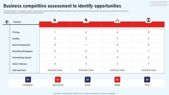 The slide displays a competitive analysis matrix based on various factors to identify opportunities to grow in business. It includes factors such as pricing, quality, brand awareness, branding strategies, advertising spend and quick delivery. Are you searching for a Comprehensive Guide For Sales And Advertising Processes Business Competitive Assessment Identify Opportunities Guidelines PDF that is uncluttered, straightforward, and original Its easy to edit, and you can change the colors to suit your personal or business branding. For a presentation that expresses how much effort you have put in, this template is ideal With all of its features, including tables, diagrams, statistics, and lists, its perfect for a business plan presentation. Make your ideas more appealing with these professional slides. Download Comprehensive Guide For Sales And Advertising Processes Business Competitive Assessment Identify Opportunities Guidelines PDF from Slidegeeks today.