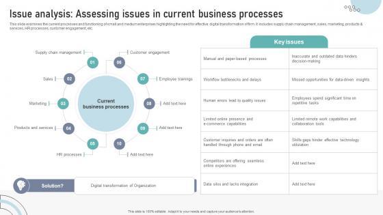 This slide examines the current processes and functioning of small and medium enterprises highlighting the need for effective digital transformation of firm. It includes supply chain management, sales, marketing, products and services, HR processes, customer engagement, etc.Get a simple yet stunning designed Issue Analysis Assessing Issues In Current Business Processes DT SS V. It is the best one to establish the tone in your meetings. It is an excellent way to make your presentations highly effective. So, download this PPT today from Slidegeeks and see the positive impacts. Our easy-to-edit Issue Analysis Assessing Issues In Current Business Processes DT SS V can be your go-to option for all upcoming conferences and meetings. So, what are you waiting for Grab this template today. This slide examines the current processes and functioning of small and medium enterprises highlighting the need for effective digital transformation of firm. It includes supply chain management, sales, marketing, products and services, HR processes, customer engagement, etc.
