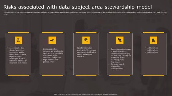 This slide depicts the risks associated with the data subject area stewardship model, including difficulty in identifying skilled data stewards, demand for tested relationship building abilities, political pitfalls within the organization and so on. Whether you have daily or monthly meetings, a brilliant presentation is necessary. Data Stewardship In Business Processes Risks Associated Data Subject Area Icons Pdf can be your best option for delivering a presentation. Represent everything in detail using Data Stewardship In Business Processes Risks Associated Data Subject Area Icons Pdf and make yourself stand out in meetings. The template is versatile and follows a structure that will cater to your requirements. All the templates prepared by Slidegeeks are easy to download and edit. Our research experts have taken care of the corporate themes as well. So, give it a try and see the results. This slide depicts the risks associated with the data subject area stewardship model, including difficulty in identifying skilled data stewards, demand for tested relationship building abilities, political pitfalls within the organization and so on.