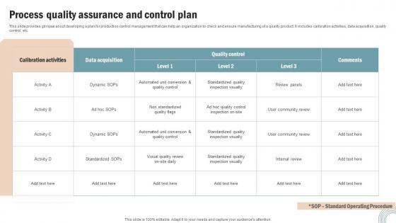 This slide provides glimpse about developing a plan for production control management that can help an organization to check and ensure manufacturing of a quality product. It includes calibration activities, data acquisition, quality control, etc. This Process Quality Assurance And Operations Strategy Improve Business Productivity Slides Pdf from Slidegeeks makes it easy to present information on your topic with precision. It provides customization options, so you can make changes to the colors, design, graphics, or any other component to create a unique layout. It is also available for immediate download, so you can begin using it right away. Slidegeeks has done good research to ensure that you have everything you need to make your presentation stand out. Make a name out there for a brilliant performance. This slide provides glimpse about developing a plan for production control management that can help an organization to check and ensure manufacturing of a quality product. It includes calibration activities, data acquisition, quality control, etc.
