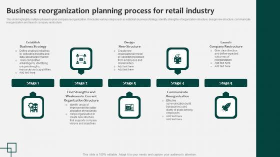 This slide highlights multiple phases to plan company reorganization. It includes various steps such as establish business strategy, identify strengths of organization structure, design new structure, communicate reorganization and launch company restructure. Showcasing this set of slides titled Business Reorganization Planning Process For Retail Industry Professional Pdf The topics addressed in these templates are Establish Business, Design New Structure, Launch Company All the content presented in this PPT design is completely editable. Download it and make adjustments in color, background, font etc. as per your unique business setting. This slide highlights multiple phases to plan company reorganization. It includes various steps such as establish business strategy, identify strengths of organization structure, design new structure, communicate reorganization and launch company restructure.
