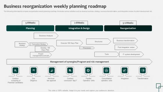 The following slide depicts company reorganization weekly planning roadmap. It includes various activities such as develop business strategy, business transformation, post integration review, it system development etc. Showcasing this set of slides titled Business Reorganization Weekly Planning Roadmap Sample Pdf The topics addressed in these templates are Business Analysis, Business Strategy, Reorganization All the content presented in this PPT design is completely editable. Download it and make adjustments in color, background, font etc. as per your unique business setting. The following slide depicts company reorganization weekly planning roadmap. It includes various activities such as develop business strategy, business transformation, post integration review, it system development etc.