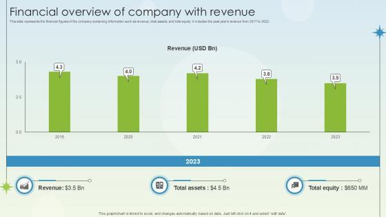This slide represents the financial figures of the company containing information such as revenue, total assets, and total equity. It includes the past years revenue from 2017 to 2022. Get a simple yet stunning designed Financial Overview Of Company With Revenue Business Growth Ppt Slides. It is the best one to establish the tone in your meetings. It is an excellent way to make your presentations highly effective. So, download this PPT today from Slidegeeks and see the positive impacts. Our easy-to-edit Financial Overview Of Company With Revenue Business Growth Ppt Slides can be your go-to option for all upcoming conferences and meetings. So, what are you waiting for Grab this template today. This slide represents the financial figures of the company containing information such as revenue, total assets, and total equity. It includes the past years revenue from 2017 to 2022.