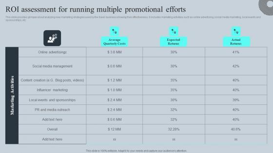 This slide provides glimpse about analyzing new marketing strategies used by the travel business showing their effectiveness. It includes marketing activities such as online advertising, social media marketing, local events and sponsorships, etc. Do you know about Slidesgeeks ROI Assessment For Running Multiple Promotional Tours And Travel Business Advertising Icons Pdf These are perfect for delivering any kind od presentation. Using it, create PowerPoint presentations that communicate your ideas and engage audiences. Save time and effort by using our pre-designed presentation templates that are perfect for a wide range of topic. Our vast selection of designs covers a range of styles, from creative to business, and are all highly customizable and easy to edit. Download as a PowerPoint template or use them as Google Slides themes. This slide provides glimpse about analyzing new marketing strategies used by the travel business showing their effectiveness. It includes marketing activities such as online advertising, social media marketing, local events and sponsorships, etc.