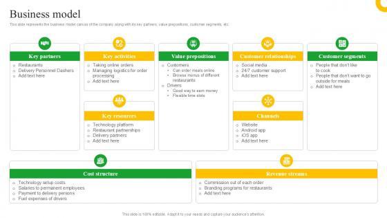 This slide represents the business model canvas of the company along with its key partners, value prepositions, customer segments, etc. If your project calls for a presentation, then Slidegeeks is your go-to partner because we have professionally designed, easy-to-edit templates that are perfect for any presentation. After downloading, you can easily edit Business Model Meal Delivery Service Investor Funding PPT Template and make the changes accordingly. You can rearrange slides or fill them with different images. Check out all the handy templates This slide represents the business model canvas of the company along with its key partners, value prepositions, customer segments, etc.