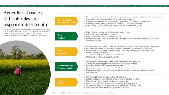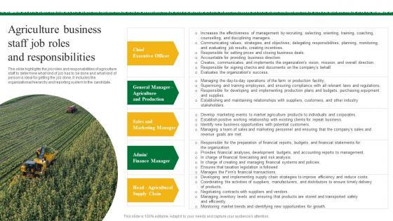 This slide highlights the job roles and responsibilities of agriculture staff to determine what kind of job has to be done and what kind of person is ideal for getting the job done. It includes the organizational hierarchy and reporting system to the candidate. Are you in need of a template that can accommodate all of your creative concepts This one is crafted professionally and can be altered to fit any style. Use it with Google Slides or PowerPoint. Include striking photographs, symbols, depictions, and other visuals. Fill, move around, or remove text boxes as desired. Test out color palettes and font mixtures. Edit and save your work, or work with colleagues. Download Agriculture Business Staff Job Roles Agriculture Business Plan Go To Market Strategy Rules Pdf and observe how to make your presentation outstanding. Give an impeccable presentation to your group and make your presentation unforgettable. This slide highlights the job roles and responsibilities of agriculture staff to determine what kind of job has to be done and what kind of person is ideal for getting the job done. It includes the organizational hierarchy and reporting system to the candidate.