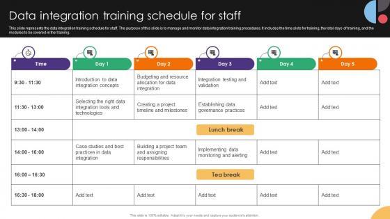 This slide represents the data integration training schedule for staff. The purpose of this slide is to manage and monitor data integration training procedures. It includes the time slots for training, the total days of training, and the modules to be covered in the training. Make sure to capture your audiences attention in your business displays with our gratis customizable Data Integration Training Schedule For Staff Data Integration Strategies For Business. These are great for business strategies, office conferences, capital raising or task suggestions. If you desire to acquire more customers for your tech business and ensure they stay satisfied, create your own sales presentation with these plain slides. This slide represents the data integration training schedule for staff. The purpose of this slide is to manage and monitor data integration training procedures. It includes the time slots for training, the total days of training, and the modules to be covered in the training.