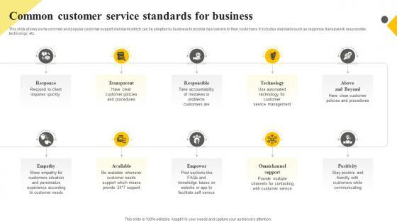 This slide shows some common and popular customer support standards which can be adopted by business to provide best service to their customers. It includes standards such as response, transparent, responsible, technology, etc. There are so many reasons you need a Client Support Plan To Increase Customer Common Customer Service Standards For Business Strategy SS V. The first reason is you can not spend time making everything from scratch, Thus, Slidegeeks has made presentation templates for you too. You can easily download these templates from our website easily. This slide shows some common and popular customer support standards which can be adopted by business to provide best service to their customers. It includes standards such as response, transparent, responsible, technology, etc.