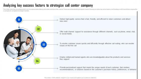 This slide covers the essential points to be considered while offering call center services in the market. These are understanding prospects needs, focusing on outcomes and emotions, and building a solid brand that is required for a company to compete in its target markets. Present like a pro with Analyzing Key Success Factors To Strategize IT And Tech Support Business Guidelines Pdf Create beautiful presentations together with your team, using our easy-to-use presentation slides. Share your ideas in real-time and make changes on the fly by downloading our templates. So whether you are in the office, on the go, or in a remote location, you can stay in sync with your team and present your ideas with confidence. With Slidegeeks presentation got a whole lot easier. Grab these presentations today. This slide covers the essential points to be considered while offering call center services in the market. These are understanding prospects needs, focusing on outcomes and emotions, and building a solid brand that is required for a company to compete in its target markets.