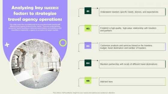 This slide covers the essential points to be considered while dealing with different travel agency products in the market. These are understanding prospects needs, focusing on outcomes and emotions, and building a solid brand that is required for a agency to compete in its target markets. Slidegeeks is here to make your presentations a breeze with Analyzing Key Success Factors To Strategize Travel Agency Vacation Planning Business Microsoft Pdf With our easy-to-use and customizable templates, you can focus on delivering your ideas rather than worrying about formatting. With a variety of designs to choose from, you are sure to find one that suits your needs. And with animations and unique photos, illustrations, and fonts, you can make your presentation pop. So whether you are giving a sales pitch or presenting to the board, make sure to check out Slidegeeks first. This slide covers the essential points to be considered while dealing with different travel agency products in the market. These are understanding prospects needs, focusing on outcomes and emotions, and building a solid brand that is required for a agency to compete in its target markets.