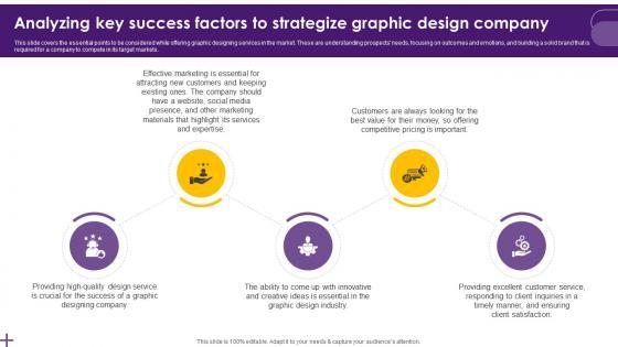 This slide covers the essential points to be considered while offering graphic designing services in the market. These are understanding prospects needs, focusing on outcomes and emotions, and building a solid brand that is required for a company to compete in its target markets. Boost your pitch with our creative Creative Agency Business Plan Analyzing Key Success Factors To Strategize Graphic Design BP SS V. Deliver an awe-inspiring pitch that will mesmerize everyone. Using these presentation templates you will surely catch everyones attention. You can browse the ppts collection on our website. We have researchers who are experts at creating the right content for the templates. So you do not have to invest time in any additional work. Just grab the template now and use them. This slide covers the essential points to be considered while offering graphic designing services in the market. These are understanding prospects needs, focusing on outcomes and emotions, and building a solid brand that is required for a company to compete in its target markets.