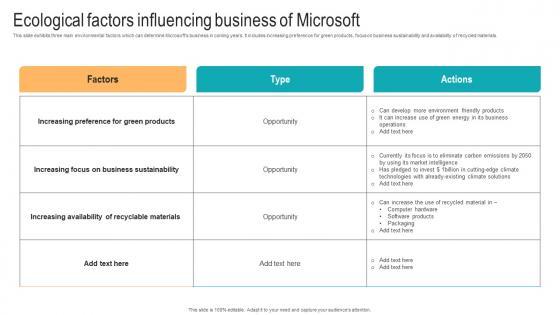 This slide exhibits three main environmental factors which can determine Microsofts business in coming years. It includes increasing preference for green products, focus on business sustainability and availability of recycled materials. Presenting this PowerPoint presentation, titled Microsoft Strategic Plan To Become Market Leader Ecological Factors Influencing Business Of Microsoft Pictures PDF, with topics curated by our researchers after extensive research. This editable presentation is available for immediate download and provides attractive features when used. Download now and captivate your audience. Presenting this Microsoft Strategic Plan To Become Market Leader Ecological Factors Influencing Business Of Microsoft Pictures PDF. Our researchers have carefully researched and created these slides with all aspects taken into consideration. This is a completely customizable Microsoft Strategic Plan To Become Market Leader Ecological Factors Influencing Business Of Microsoft Pictures PDF that is available for immediate downloading. Download now and make an impact on your audience. Highlight the attractive features available with our PPTs.