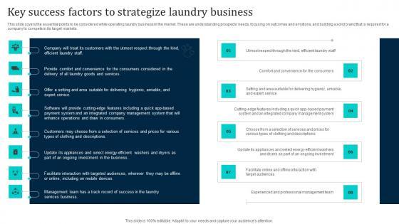 Welcome to our selection of the Key Success Factors To Strategize Laundry Business On Demand Laundry Business Plan Infographics Pdf These are designed to help you showcase your creativity and bring your sphere to life. Planning and Innovation are essential for any business that is just starting out. This collection contains the designs that you need for your everyday presentations. All of our PowerPoints are 100Precent editable, so you can customize them to suit your needs. This multi purpose template can be used in various situations. Grab these presentation templates today. This slide covers the essential points to be considered while operating laundry business in the market. These are understanding prospects needs, focusing on outcomes and emotions, and building a solid brand that is required for a company to compete in its target markets.