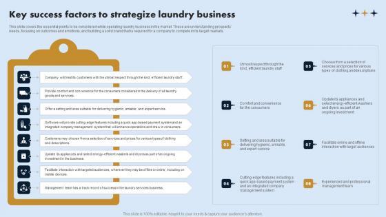 This slide covers the essential points to be considered while operating laundry business in the market. These are understanding prospects needs, focusing on outcomes and emotions, and building a solid brand that is required for a company to compete in its target markets. Whether you have daily or monthly meetings, a brilliant presentation is necessary. Key Success Factors To Strategize Laundry Business Elements PDF can be your best option for delivering a presentation. Represent everything in detail using Key Success Factors To Strategize Laundry Business Elements PDF and make yourself stand out in meetings. The template is versatile and follows a structure that will cater to your requirements. All the templates prepared by Slidegeeks are easy to download and edit. Our research experts have taken care of the corporate themes as well. So, give it a try and see the results.