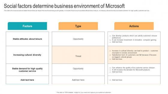 This slide shows sociocultural related factors that can impact Microsoft business growth globally. It includes factors such as stable attitude about leisure, increasing cultural diversity and stable demand for high quality customer service. Get a simple yet stunning designed Social Factors Determine Business Environment Strategic Advancements By Microsofts Slides Pdf. It is the best one to establish the tone in your meetings. It is an excellent way to make your presentations highly effective. So, download this PPT today from Slidegeeks and see the positive impacts. Our easy-to-edit Social Factors Determine Business Environment Strategic Advancements By Microsofts Slides Pdf can be your go-to option for all upcoming conferences and meetings. So, what are you waiting for Grab this template today. This slide shows sociocultural related factors that can impact Microsoft business growth globally. It includes factors such as stable attitude about leisure, increasing cultural diversity and stable demand for high quality customer service.